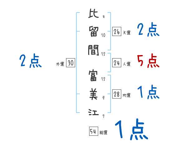 外運![]() | 比留間富美江さんの外運は30画の2つ星!浮き沈みの激しさに注意しましょう。 生活面を象徴する運勢です。外部から受ける影響力を表し、結婚運、家庭運や職場、環境への順応性を表します。 |