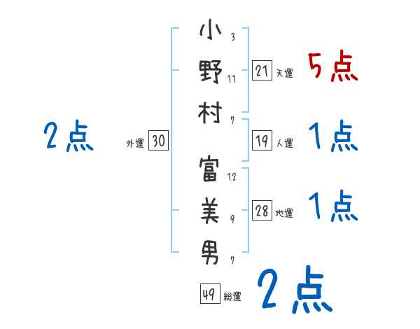 外運![]() | 小野村富美男さんの外運は30画の2つ星!浮き沈みの激しさに注意しましょう。 生活面を象徴する運勢です。外部から受ける影響力を表し、結婚運、家庭運や職場、環境への順応性を表します。 |