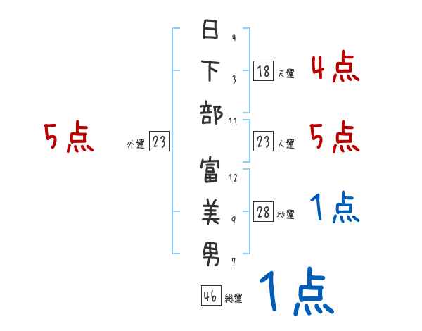 天運![]() | 日下部富美男さんの天運は18画の4つ星!情熱的で剛気。忍耐力があり信頼される。 家系が持つ宿命的な運勢を表します。祖先から受け継いだ苗字ですので自分の力が及びません。家柄を象徴します。 |