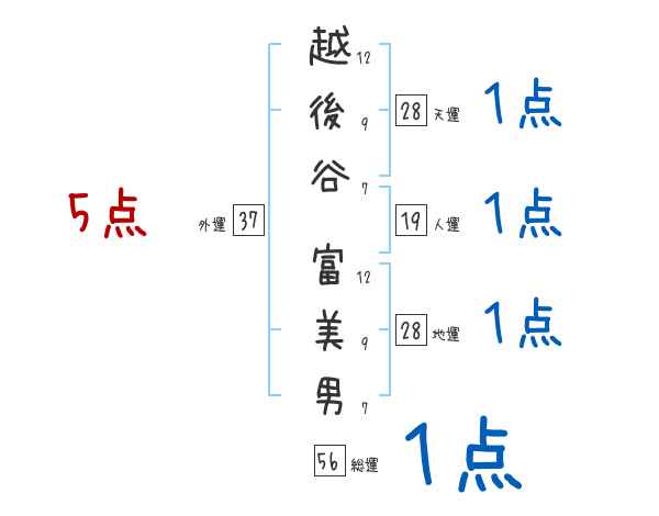 天運![]() | 越後谷富美男さんの天運は28画の1つ星!家庭環境に注意。スポーツで活躍できる能力があるかも。 家系が持つ宿命的な運勢を表します。祖先から受け継いだ苗字ですので自分の力が及びません。家柄を象徴します。 |