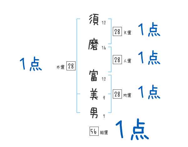 天運![]() | 須磨富美男さんの天運は28画の1つ星!家庭環境に注意。スポーツで活躍できる能力があるかも。 家系が持つ宿命的な運勢を表します。祖先から受け継いだ苗字ですので自分の力が及びません。家柄を象徴します。 |