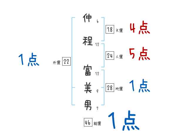 人運![]() | 仲程富美男さんの人運は24画の5つ星!家庭運が良く順調な人生。金運にも恵まれる。 性格や才能などを表す2番目に重要な運勢です。人間関係や協調性、社会的な成功に影響します。主に20歳から50歳ぐらいまでの中年期の運勢を表します。 |