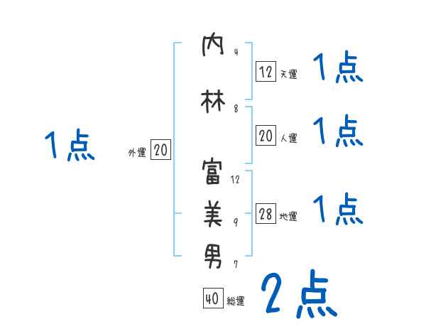 天運![]() | 内林富美男さんの天運は12画の1つ星!簡単な失敗で諦めてしまいやすいかも。着実に行動すると良いでしょう。 家系が持つ宿命的な運勢を表します。祖先から受け継いだ苗字ですので自分の力が及びません。家柄を象徴します。 |