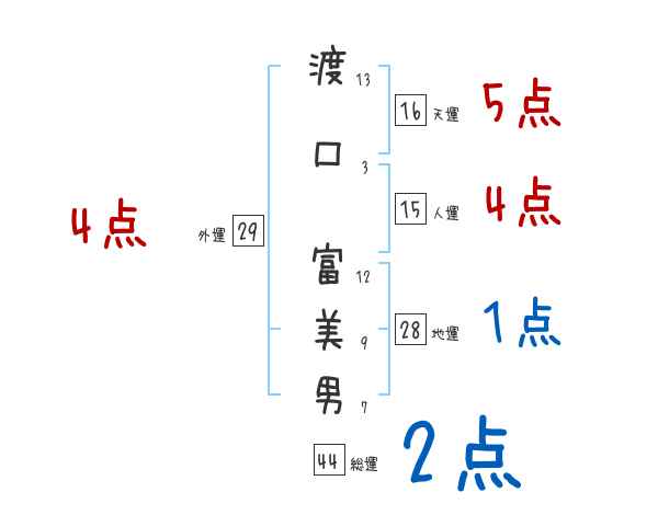 外運![]() | 渡口富美男さんの外運は29画の4つ星!完全主義で才能がある。厳格な心の持ち主。 生活面を象徴する運勢です。外部から受ける影響力を表し、結婚運、家庭運や職場、環境への順応性を表します。 |