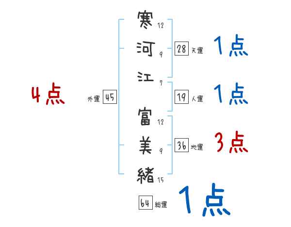 天運![]() | 寒河江富美緒さんの天運は28画の1つ星!家庭環境に注意。スポーツで活躍できる能力があるかも。 家系が持つ宿命的な運勢を表します。祖先から受け継いだ苗字ですので自分の力が及びません。家柄を象徴します。 |