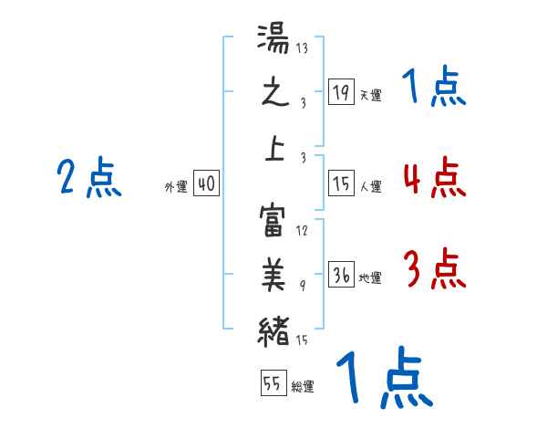総運![]() | 湯之上富美緒さんの総運は55画の1つ星!欲張りな性格で軽率な行動に注意しましょう。病気に気をつけて。 あなたの人生を表す1番重要な運勢です。生涯を通じて影響する総合運となり、主に50歳以降の晩年期に影響を及ぼします。 |