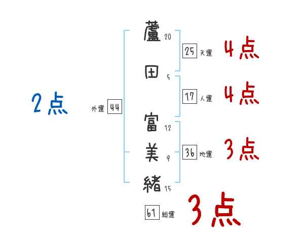 外運![]() | 蘆田富美緒さんの外運は44画の2つ星!誠実で慎重な性格。物事を考えすぎないように注意しましょう。 生活面を象徴する運勢です。外部から受ける影響力を表し、結婚運、家庭運や職場、環境への順応性を表します。 |