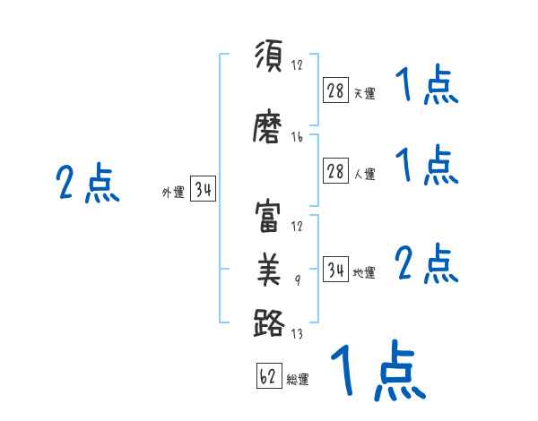 天運![]() | 須磨富美路さんの天運は28画の1つ星!家庭環境に注意。スポーツで活躍できる能力があるかも。 家系が持つ宿命的な運勢を表します。祖先から受け継いだ苗字ですので自分の力が及びません。家柄を象徴します。 |
