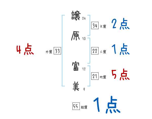 人運![]() | 譲原富美さんの人運は22画の1つ星!努力することが苦手ないっぽう手先が器用。芸術性にも優れる。 性格や才能などを表す2番目に重要な運勢です。人間関係や協調性、社会的な成功に影響します。主に20歳から50歳ぐらいまでの中年期の運勢を表します。 |