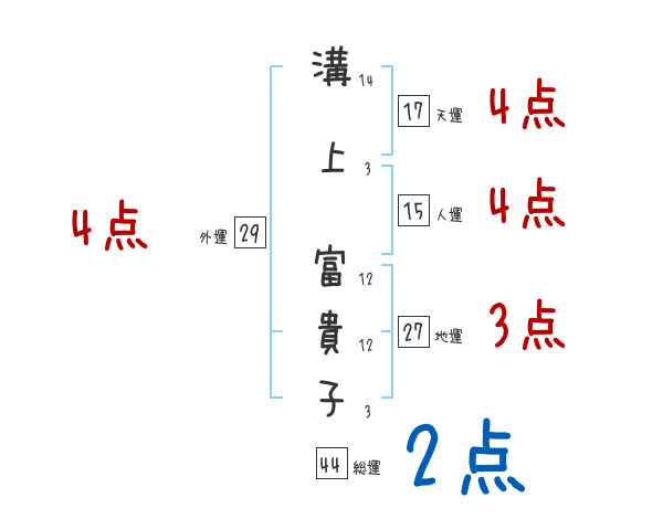 外運![]() | 溝上富貴子さんの外運は29画の4つ星!完全主義で才能がある。厳格な心の持ち主。 生活面を象徴する運勢です。外部から受ける影響力を表し、結婚運、家庭運や職場、環境への順応性を表します。 |