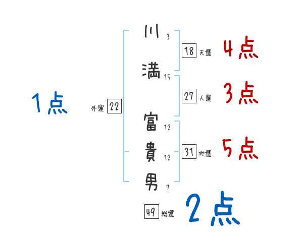 | 地運  | 川満富貴男さんの地運は31画の5つ星!社交性があり判断力に優れる。順風満帆な人生で円満な生活。個性を表す基礎的な運勢です。性格形成や対人関係、行動力など家庭環境に影響されます。主に誕生してから20歳くらいまでの若年期の運勢を表します。 |