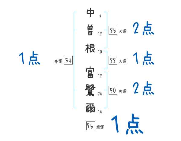 人運![]() | 中曽根富鷺爾さんの人運は22画の1つ星!努力することが苦手ないっぽう手先が器用。芸術性にも優れる。 性格や才能などを表す2番目に重要な運勢です。人間関係や協調性、社会的な成功に影響します。主に20歳から50歳ぐらいまでの中年期の運勢を表します。 |