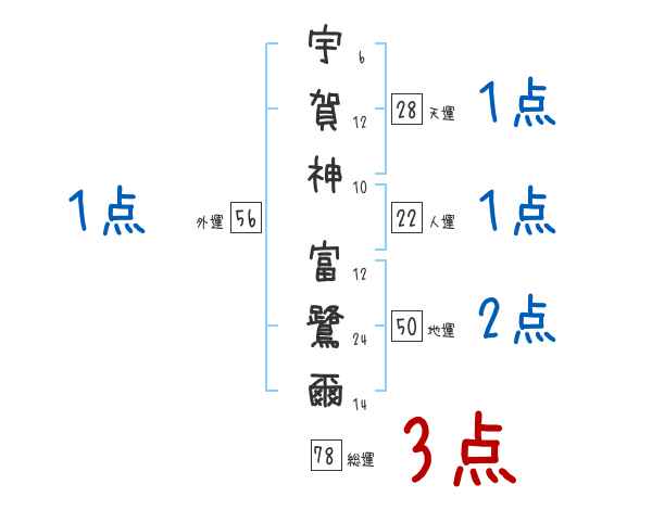 天運![]() | 宇賀神富鷺爾さんの天運は28画の1つ星!家庭環境に注意。スポーツで活躍できる能力があるかも。 家系が持つ宿命的な運勢を表します。祖先から受け継いだ苗字ですので自分の力が及びません。家柄を象徴します。 |
