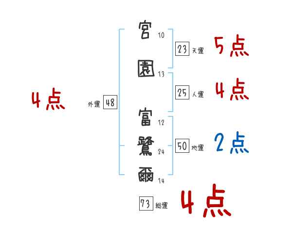 天運![]() | 宮園富鷺爾さんの天運は23画の5つ星!想像力に優れ活力がある。一代で成功し名誉を手に入れる。 家系が持つ宿命的な運勢を表します。祖先から受け継いだ苗字ですので自分の力が及びません。家柄を象徴します。 |