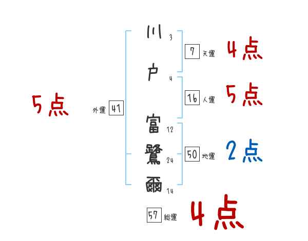 天運![]() | 川戸富鷺爾さんの天運は7画の4つ星!強い意志や信念を持ち独立心が強い。自立する。 家系が持つ宿命的な運勢を表します。祖先から受け継いだ苗字ですので自分の力が及びません。家柄を象徴します。 |