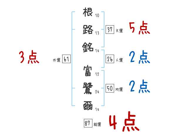 地運![]() | 根路銘富鷺爾さんの地運は50画の2つ星!浮き沈みが激しく不安定。しりすぼみに衰退しやすいので注意しましょう。 個性を表す基礎的な運勢です。性格形成や対人関係、行動力など家庭環境に影響されます。主に誕生してから20歳くらいまでの若年期の運勢を表します。 |