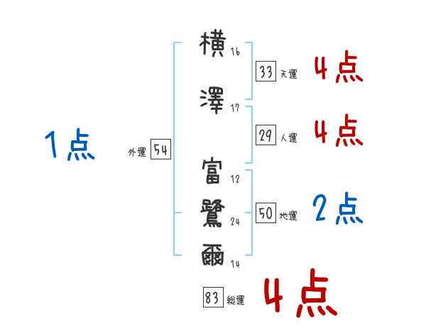 天運![]() | 横澤富鷺爾さんの天運は33画の4つ星!権力志向でプライドが高い。勇気があり運を切り開き成功する。 家系が持つ宿命的な運勢を表します。祖先から受け継いだ苗字ですので自分の力が及びません。家柄を象徴します。 |