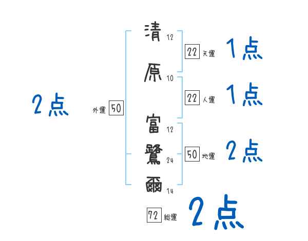 総運![]() | 清原富鷺爾さんの総運は72画の2つ星!災難が多く不安定な生活にならないように注意。明暗のある人生かも。 あなたの人生を表す1番重要な運勢です。生涯を通じて影響する総合運となり、主に50歳以降の晩年期に影響を及ぼします。 |