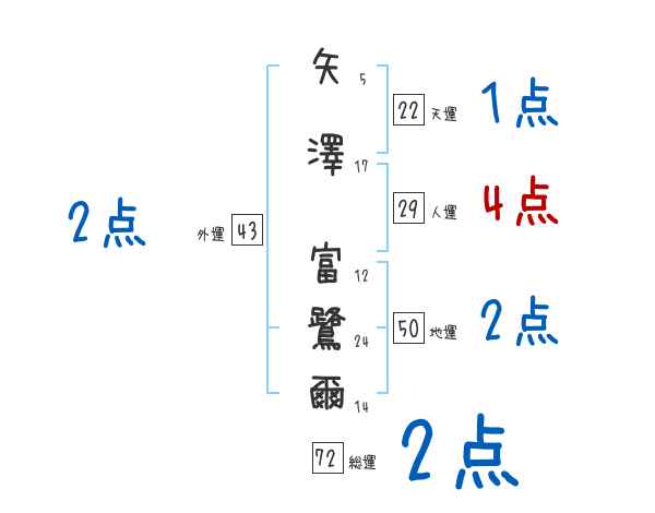 天運![]() | 矢澤富鷺爾さんの天運は22画の1つ星!努力することが苦手ないっぽう手先が器用。芸術性にも優れる。 家系が持つ宿命的な運勢を表します。祖先から受け継いだ苗字ですので自分の力が及びません。家柄を象徴します。 |