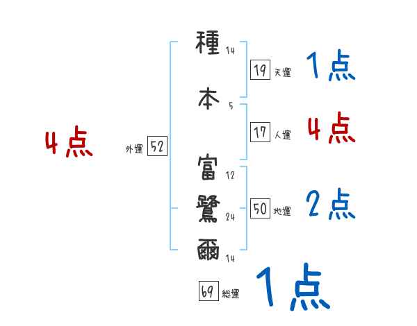 外運![]() | 種本富鷺爾さんの外運は52画の4つ星!先見性と独創性に優れ考える力がある。強運の持ち主。 生活面を象徴する運勢です。外部から受ける影響力を表し、結婚運、家庭運や職場、環境への順応性を表します。 |
