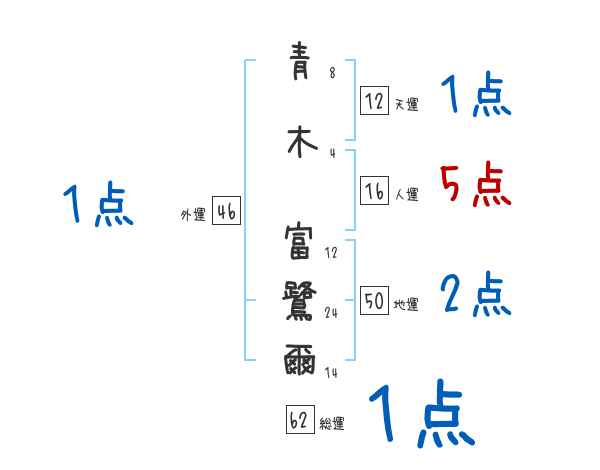 人運![]() | 青木富鷺爾さんの人運は16画の5つ星!人望が厚く大きく発展する。逆転成功が見える。 性格や才能などを表す2番目に重要な運勢です。人間関係や協調性、社会的な成功に影響します。主に20歳から50歳ぐらいまでの中年期の運勢を表します。 |