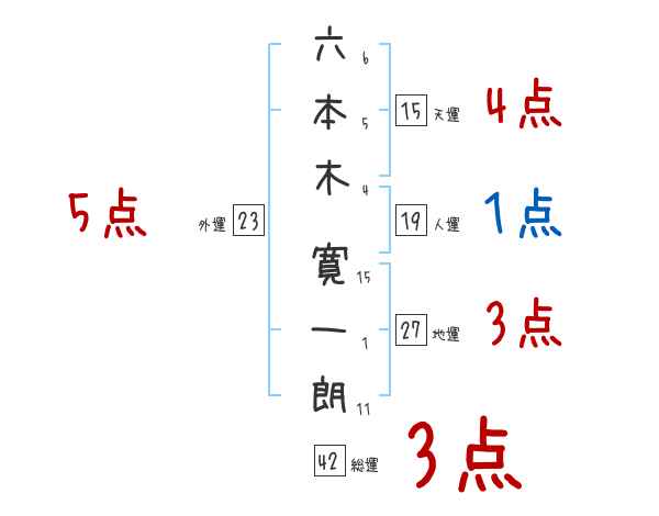 総運![]() | 六本木寛一朗さんの総運は42画の3つ星!病気に注意。多芸であるが消極的でおとなしい。 あなたの人生を表す1番重要な運勢です。生涯を通じて影響する総合運となり、主に50歳以降の晩年期に影響を及ぼします。 |