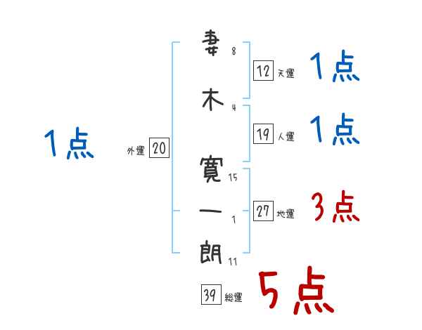 天運![]() | 妻木寛一朗さんの天運は12画の1つ星!簡単な失敗で諦めてしまいやすいかも。着実に行動すると良いでしょう。 家系が持つ宿命的な運勢を表します。祖先から受け継いだ苗字ですので自分の力が及びません。家柄を象徴します。 |