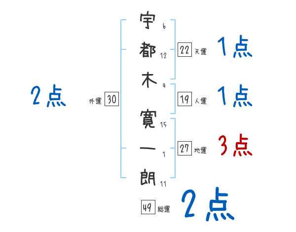 天運![]() | 宇都木寛一朗さんの天運は22画の1つ星!努力することが苦手ないっぽう手先が器用。芸術性にも優れる。 家系が持つ宿命的な運勢を表します。祖先から受け継いだ苗字ですので自分の力が及びません。家柄を象徴します。 |