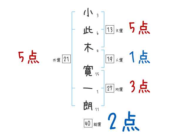 外運![]() | 小此木寛一朗さんの外運は21画の5つ星!統率力がある。独立し成功する。名誉を手に入れる。 生活面を象徴する運勢です。外部から受ける影響力を表し、結婚運、家庭運や職場、環境への順応性を表します。 |