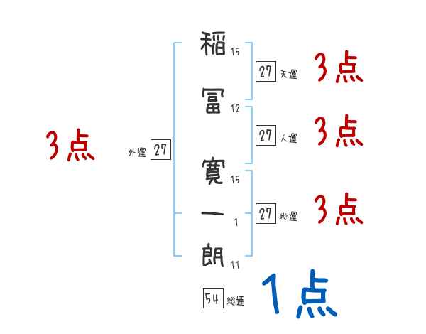 天運![]() | 稲冨寛一朗さんの天運は27画の3つ星!頭脳明晰だが強情で摩擦が多い傾向。孤立に注意。 家系が持つ宿命的な運勢を表します。祖先から受け継いだ苗字ですので自分の力が及びません。家柄を象徴します。 |
