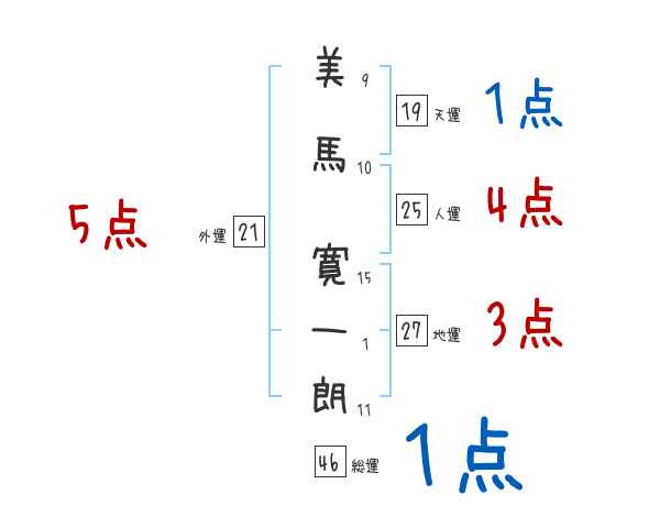 外運![]() | 美馬寛一朗さんの外運は21画の5つ星!統率力がある。独立し成功する。名誉を手に入れる。 生活面を象徴する運勢です。外部から受ける影響力を表し、結婚運、家庭運や職場、環境への順応性を表します。 |