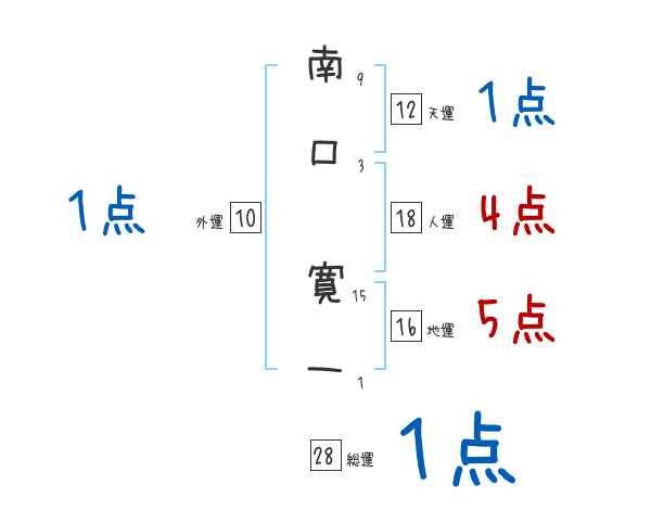 総運![]() | 南口寛一さんの総運は28画の1つ星!家庭環境に注意。スポーツで活躍できる能力があるかも。 あなたの人生を表す1番重要な運勢です。生涯を通じて影響する総合運となり、主に50歳以降の晩年期に影響を及ぼします。 |