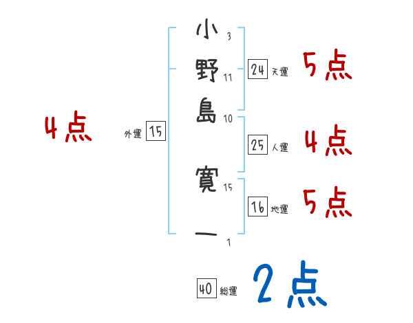 天運![]() | 小野島寛一さんの天運は24画の5つ星!家庭運が良く順調な人生。金運にも恵まれる。 家系が持つ宿命的な運勢を表します。祖先から受け継いだ苗字ですので自分の力が及びません。家柄を象徴します。 |