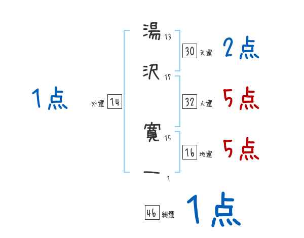 人運![]() | 湯沢寛一さんの人運は32画の5つ星!柔軟性があり成功する。チャンスが多く金運が良い。 性格や才能などを表す2番目に重要な運勢です。人間関係や協調性、社会的な成功に影響します。主に20歳から50歳ぐらいまでの中年期の運勢を表します。 |
