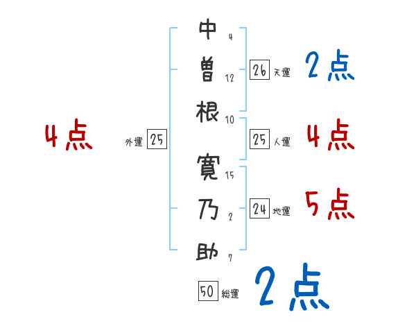 天運![]() | 中曽根寛乃助さんの天運は26画の2つ星!波瀾万丈かも。信頼できる人を大事にしましょう。 家系が持つ宿命的な運勢を表します。祖先から受け継いだ苗字ですので自分の力が及びません。家柄を象徴します。 |