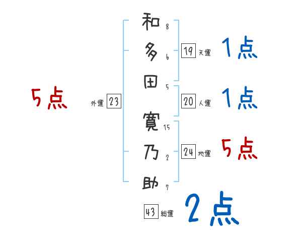 外運![]() | 和多田寛乃助さんの外運は23画の5つ星!想像力に優れ活力がある。一代で成功し名誉を手に入れる。 生活面を象徴する運勢です。外部から受ける影響力を表し、結婚運、家庭運や職場、環境への順応性を表します。 |