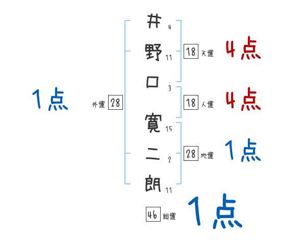 天運![]() | 井野口寛二朗さんの天運は18画の4つ星!情熱的で剛気。忍耐力があり信頼される。 家系が持つ宿命的な運勢を表します。祖先から受け継いだ苗字ですので自分の力が及びません。家柄を象徴します。 |