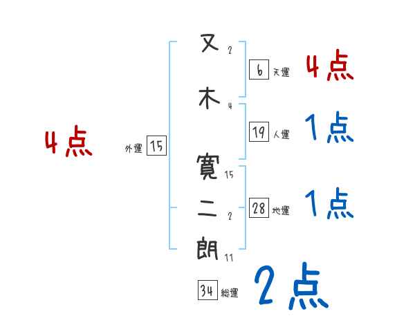 天運![]() | 又木寛二朗さんの天運は6画の4つ星!慎重な努力家で信頼を得る。誠実な精神で向上心に優れる。 家系が持つ宿命的な運勢を表します。祖先から受け継いだ苗字ですので自分の力が及びません。家柄を象徴します。 |