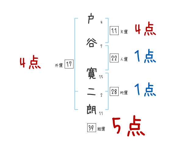 | 天運  | 戸谷寛二朗さんの天運は11画の4つ星!着実に富や地位を得る幸運な人生。家系が持つ宿命的な運勢を表します。祖先から受け継いだ苗字ですので自分の力が及びません。家柄を象徴します。 |