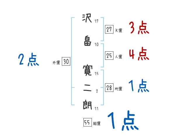 天運![]() | 沢畠寛二朗さんの天運は27画の3つ星!頭脳明晰だが強情で摩擦が多い傾向。孤立に注意。 家系が持つ宿命的な運勢を表します。祖先から受け継いだ苗字ですので自分の力が及びません。家柄を象徴します。 |