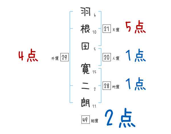 外運![]() | 羽根田寛二朗さんの外運は29画の4つ星!完全主義で才能がある。厳格な心の持ち主。 生活面を象徴する運勢です。外部から受ける影響力を表し、結婚運、家庭運や職場、環境への順応性を表します。 |