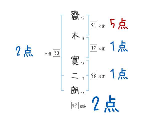 天運![]() | 齋木寛二朗さんの天運は21画の5つ星!統率力がある。独立し成功する。名誉を手に入れる。 家系が持つ宿命的な運勢を表します。祖先から受け継いだ苗字ですので自分の力が及びません。家柄を象徴します。 |