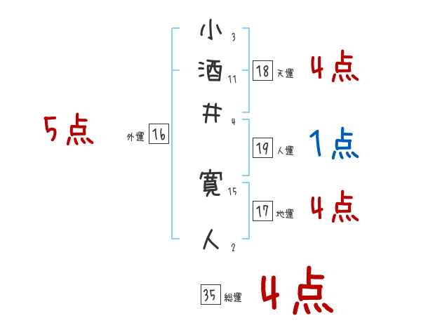 外運![]() | 小酒井寛人さんの外運は16画の5つ星!人望が厚く大きく発展する。逆転成功が見える。 生活面を象徴する運勢です。外部から受ける影響力を表し、結婚運、家庭運や職場、環境への順応性を表します。 |