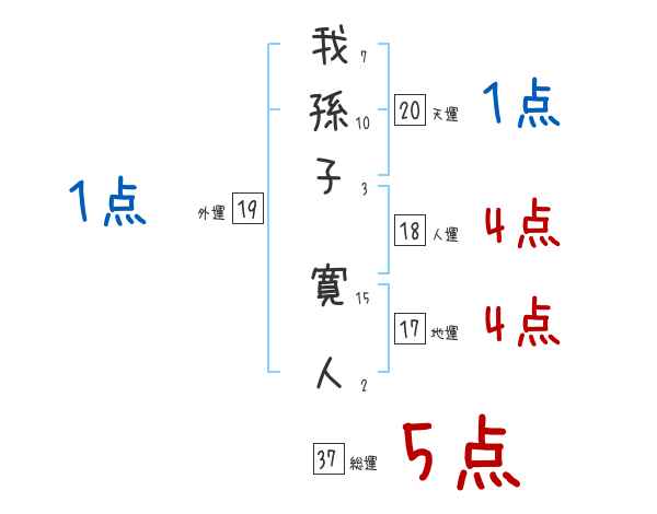 外運![]() | 我孫子寛人さんの外運は19画の1つ星!優れた才能を持ちますが、協調性が足りないことも。周りの人と協力する事を意識しましょう。 生活面を象徴する運勢です。外部から受ける影響力を表し、結婚運、家庭運や職場、環境への順応性を表します。 |