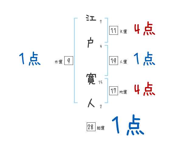 人運![]() | 江戸寛人さんの人運は19画の1つ星!優れた才能を持ちますが、協調性が足りないことも。周りの人と協力する事を意識しましょう。 性格や才能などを表す2番目に重要な運勢です。人間関係や協調性、社会的な成功に影響します。主に20歳から50歳ぐらいまでの中年期の運勢を表します。 |