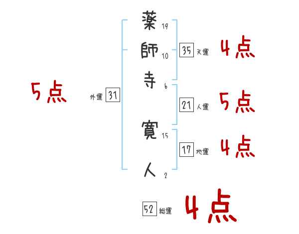 天運![]() | 薬師寺寛人さんの天運は35画の4つ星!温厚な性格で感受性が高い。穏和な性格で人望が厚い。 家系が持つ宿命的な運勢を表します。祖先から受け継いだ苗字ですので自分の力が及びません。家柄を象徴します。 |