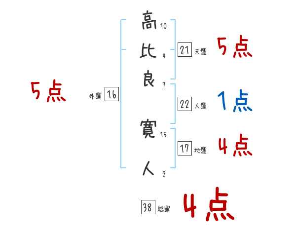 天運![]() | 高比良寛人さんの天運は21画の5つ星!統率力がある。独立し成功する。名誉を手に入れる。 家系が持つ宿命的な運勢を表します。祖先から受け継いだ苗字ですので自分の力が及びません。家柄を象徴します。 |