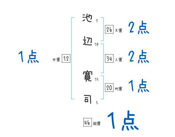 総運![]() | 池辺寛司さんの総運は46画の1つ星!迷走することが多く苦労するかも。目先のことにとらわれないように。 あなたの人生を表す1番重要な運勢です。生涯を通じて影響する総合運となり、主に50歳以降の晩年期に影響を及ぼします。 |