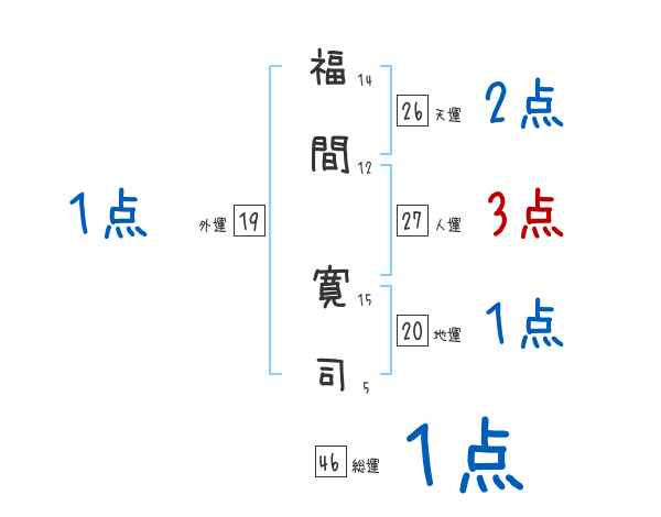 天運![]() | 福間寛司さんの天運は26画の2つ星!波瀾万丈かも。信頼できる人を大事にしましょう。 家系が持つ宿命的な運勢を表します。祖先から受け継いだ苗字ですので自分の力が及びません。家柄を象徴します。 |