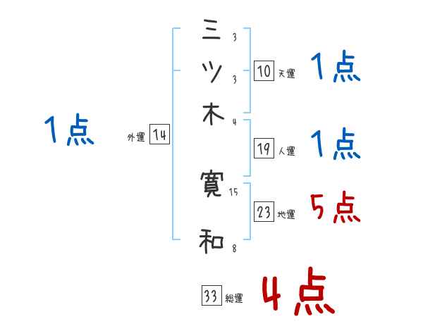 人運![]() | 三ツ木寛和さんの人運は19画の1つ星!優れた才能を持ちますが、協調性が足りないことも。周りの人と協力する事を意識しましょう。 性格や才能などを表す2番目に重要な運勢です。人間関係や協調性、社会的な成功に影響します。主に20歳から50歳ぐらいまでの中年期の運勢を表します。 |